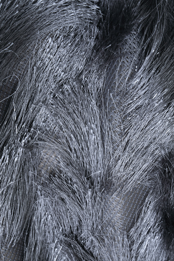Tessuto da sera con nappine grigie cucite e nastri trasparenti. Nappe cucite a forma di onda. Il tessuto è leggermente trasparente, elastico e morbido.