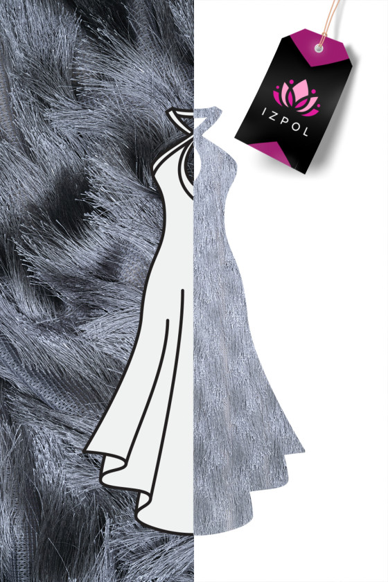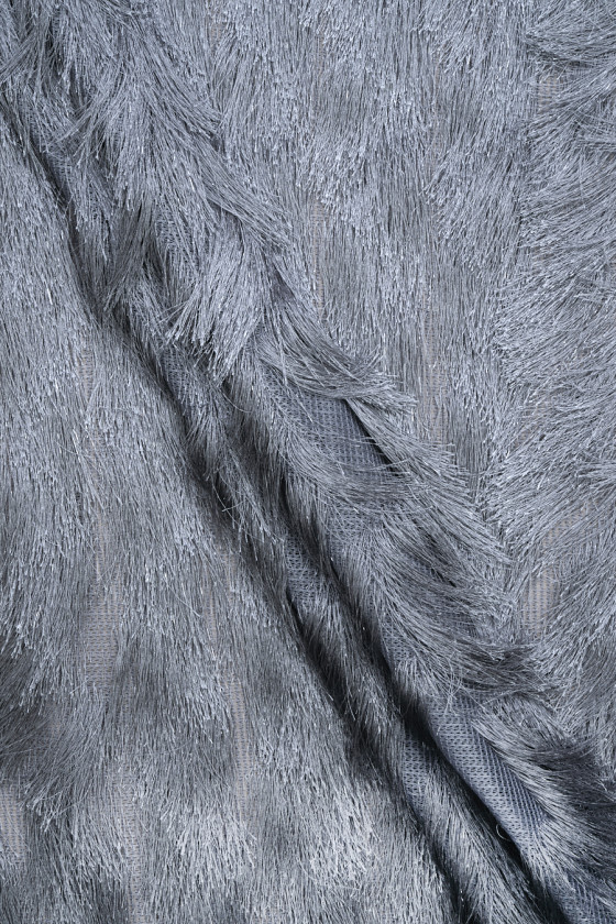 Tessuto da sera con nappine grigie cucite e nastri trasparenti. Nappe cucite a forma di onda. La rete è larga 140 cm, le frange sono larghe 125 cm. Il tessuto è leggermente trasparente, elastico e morbido: una bella proposta per cucire un abito da sera, una camicetta, una gonna.
