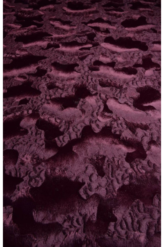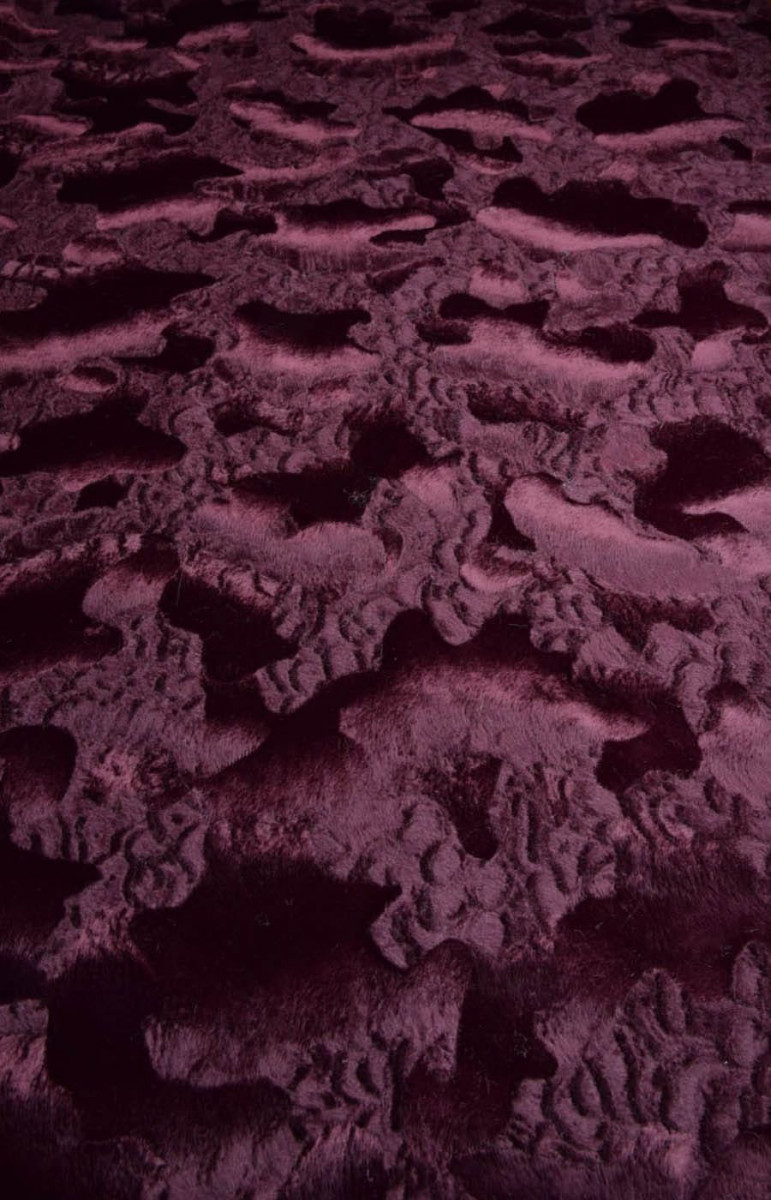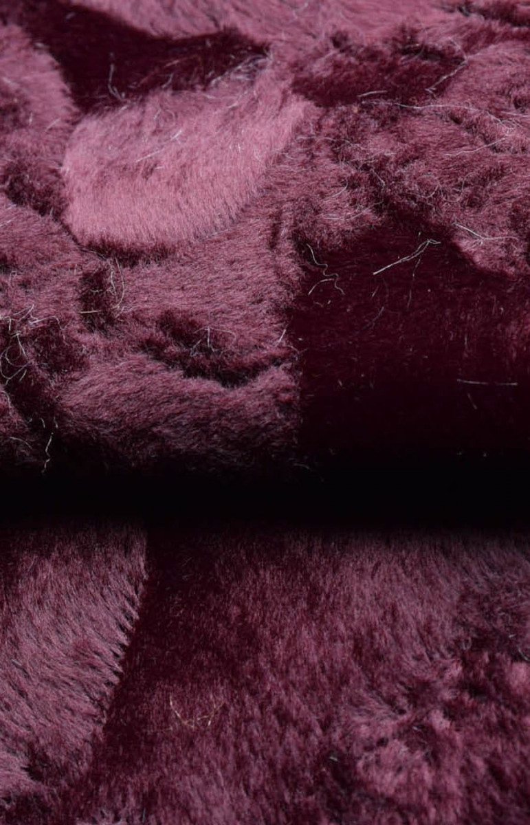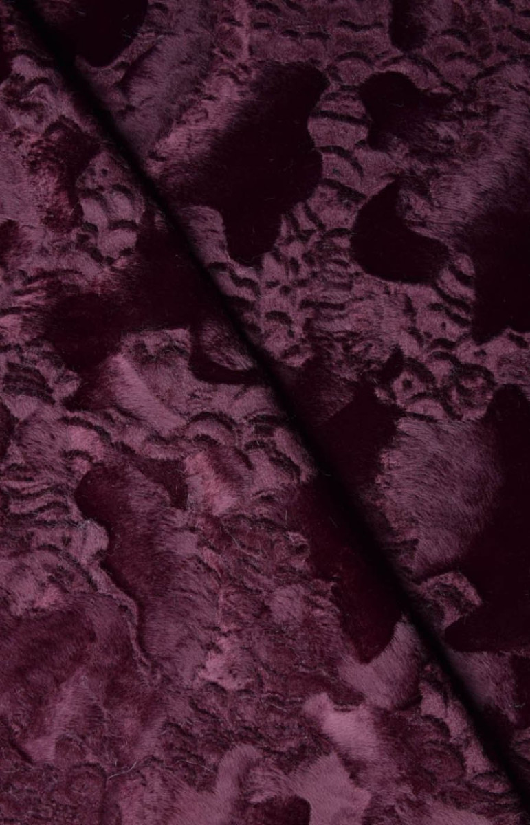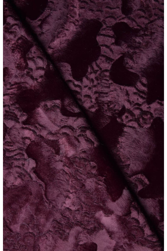 La pelliccia è di colore bordeaux, con peli corti disposti in diverse direzioni, che creano motivi. Il tessuto è di medio spessore, non elastico e rifinito con una leggera lucentezza. È disponibile un coupon recente che può essere utilizzato per extra come una cintura o inserti.