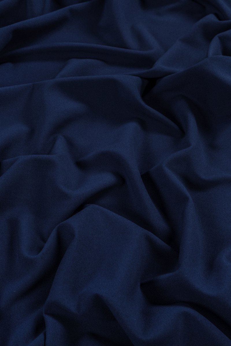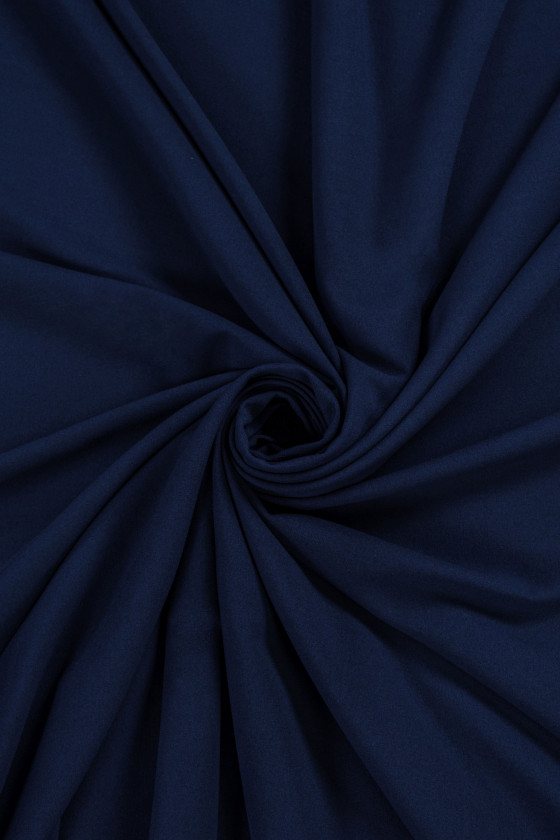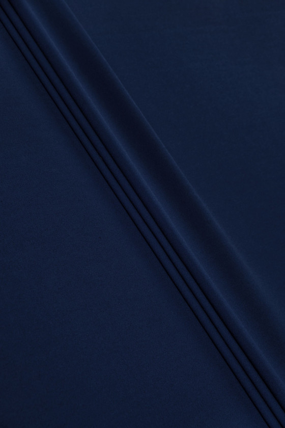 Abito cadi italiano in tessuto con trama georgette in blu navy. Il tessuto dell'abito Cadi è opaco, carnoso, fluido (pesante) e anelastico. Puoi usarlo per cucire abiti, camicette, gonne, pantaloni, costumi.