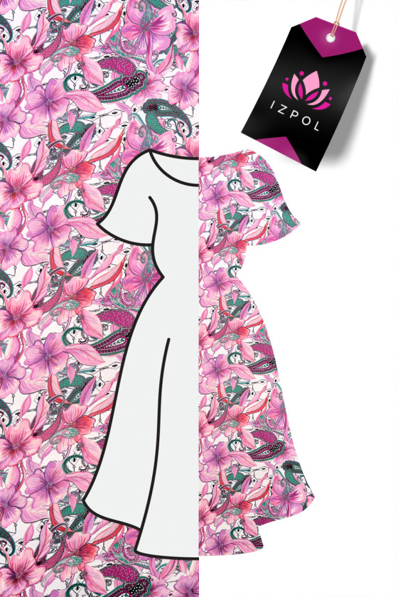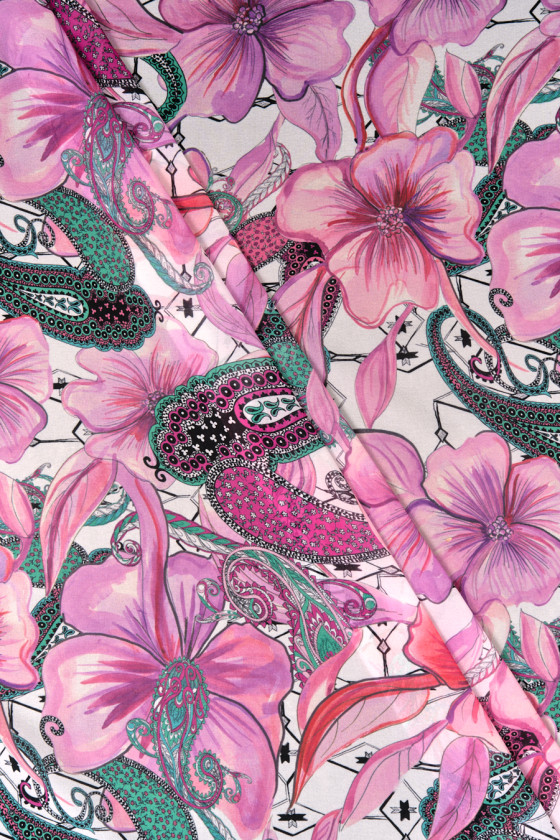 Chiffon italiano in poliestere color crema con un fitto motivo di grandi fiori rosa porpora. Il tutto è contornato da motivi paisley orientali in verde, rosa e nero e da piccole frecce nere. Il tessuto è sottile e fluido, quindi è perfetto per cucire un vestito estivo o una camicetta. Una proposta fantastica per gli appassionati di motivi orientali nei colori primaverili.
