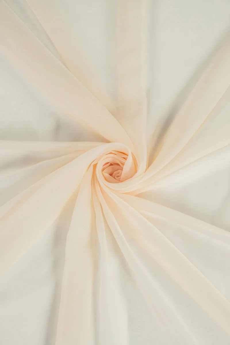 Chiffon di poliestere italiano color champagne. Il chiffon di poliestere è un tessuto leggero, arioso, morbido e trasparente. Perfetto per cucire un vestito, una camicetta, una gonna, una sciarpa. Come fodera, suggeriamo di scegliere crepe di raso o poliestere di colore identico.