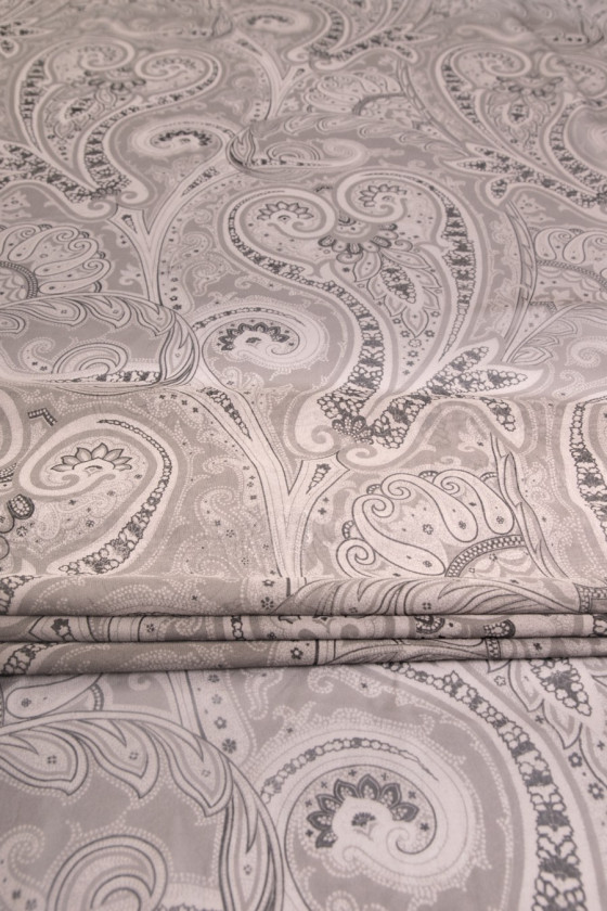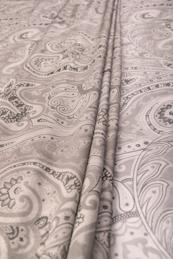 Chiffon di seta fantasia orientale paisley nei toni del grigio con il nero. Si tratta di un tessuto molto delicato, trasparente (necessita di fodera). Perfetto per abiti ariosi e camicette. Una proposta per la calura estiva, tessuto 100% naturale, molto arioso.