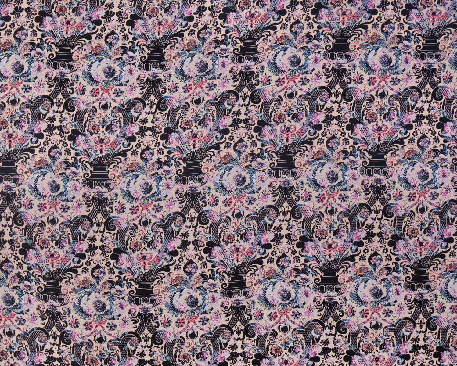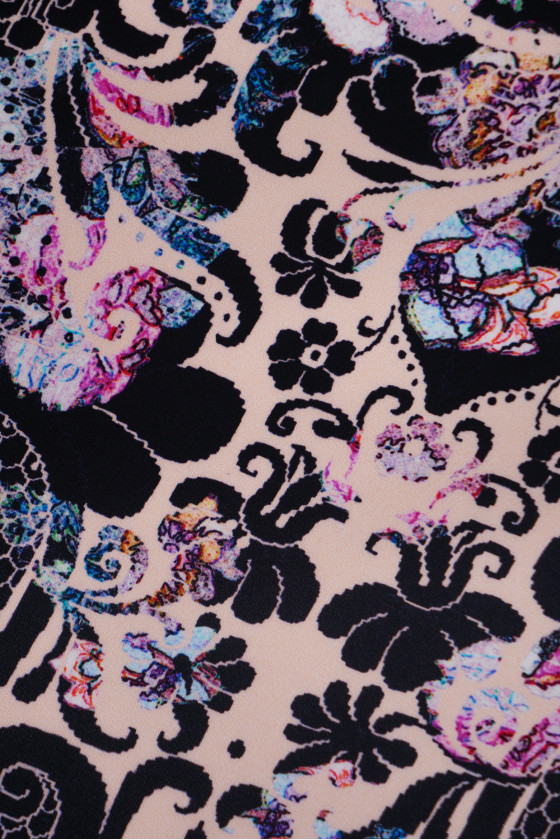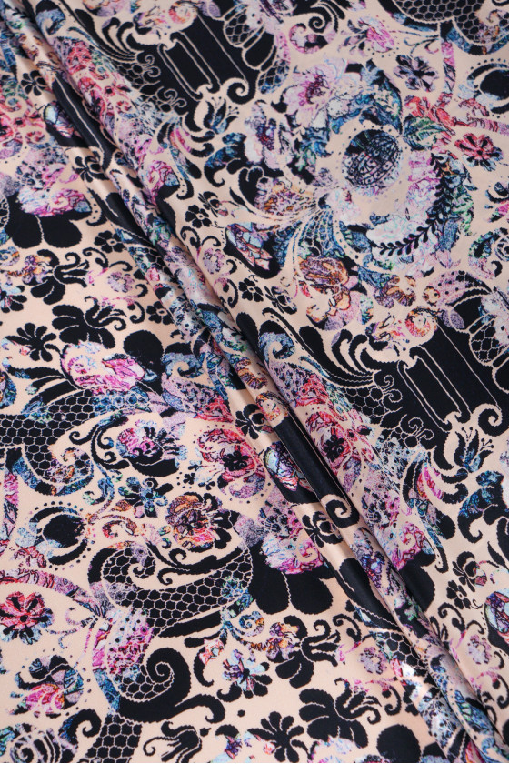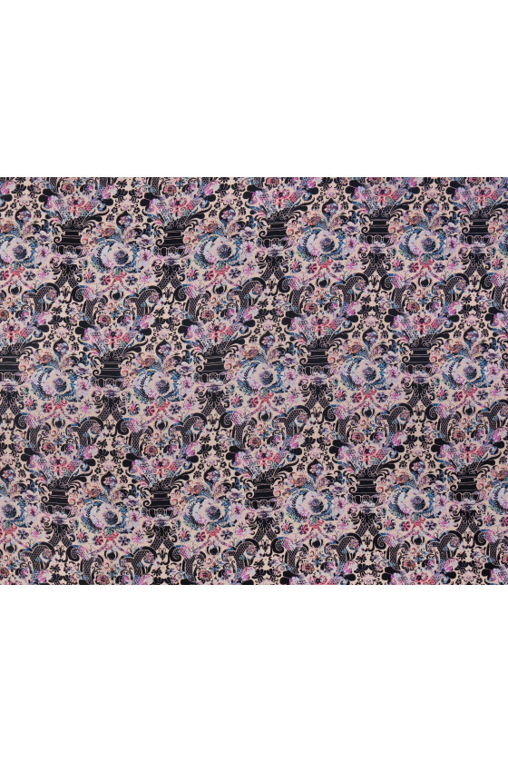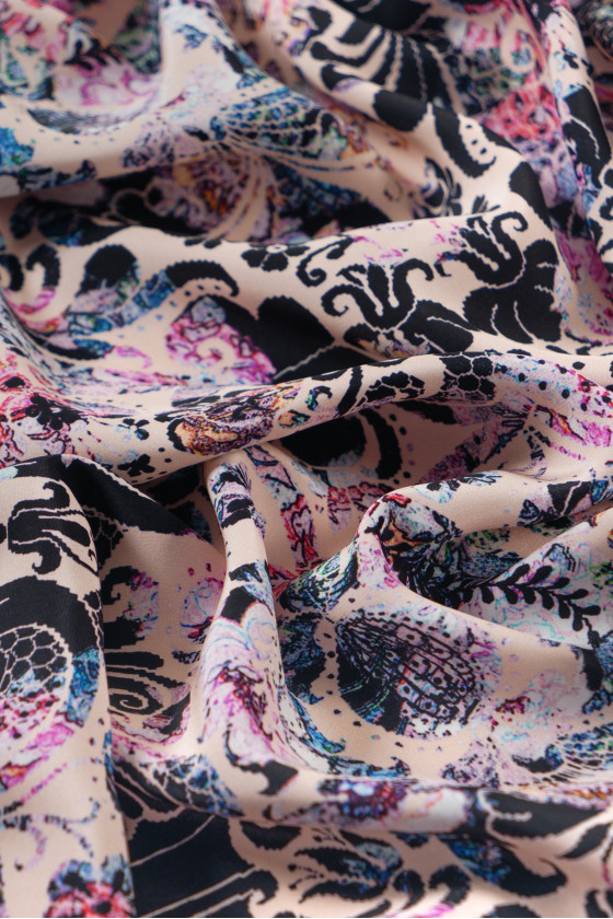 Raso italiano 100% seta con motivo orientale in rosa e nero. Il tessuto è stampato su un lato opaco. Il raso di seta è un tessuto delicato, vellutato al tatto. Può essere utilizzato per evocare abiti ariosi, camicette delicate, sciarpe, sciarpe. Composizione: 100% seta naturale