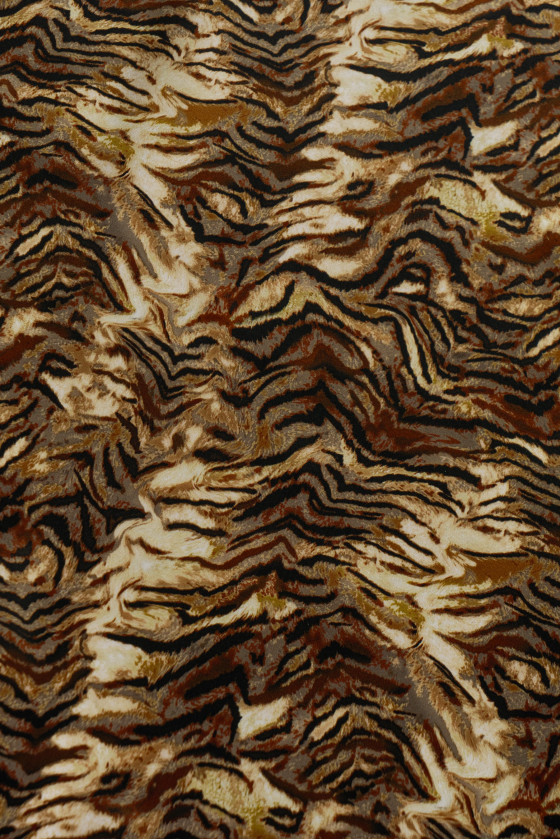 Raso italiano 100% seta con motivo animalier nei colori nero e marrone. Il raso di seta è un tessuto denso e leggero con una superficie piana, realizzato in una trama di raso. Un ulteriore vantaggio è la sua scorrevolezza e durata, oltre al fatto che si adatta molto bene, non si vede ed è piacevole al tatto. Da un lato è opaco e dall'altro è nobilmente lucido. Può essere utilizzato per evocare abiti ariosi, camicette delicate, gonne, sciarpe, sciarpe.
