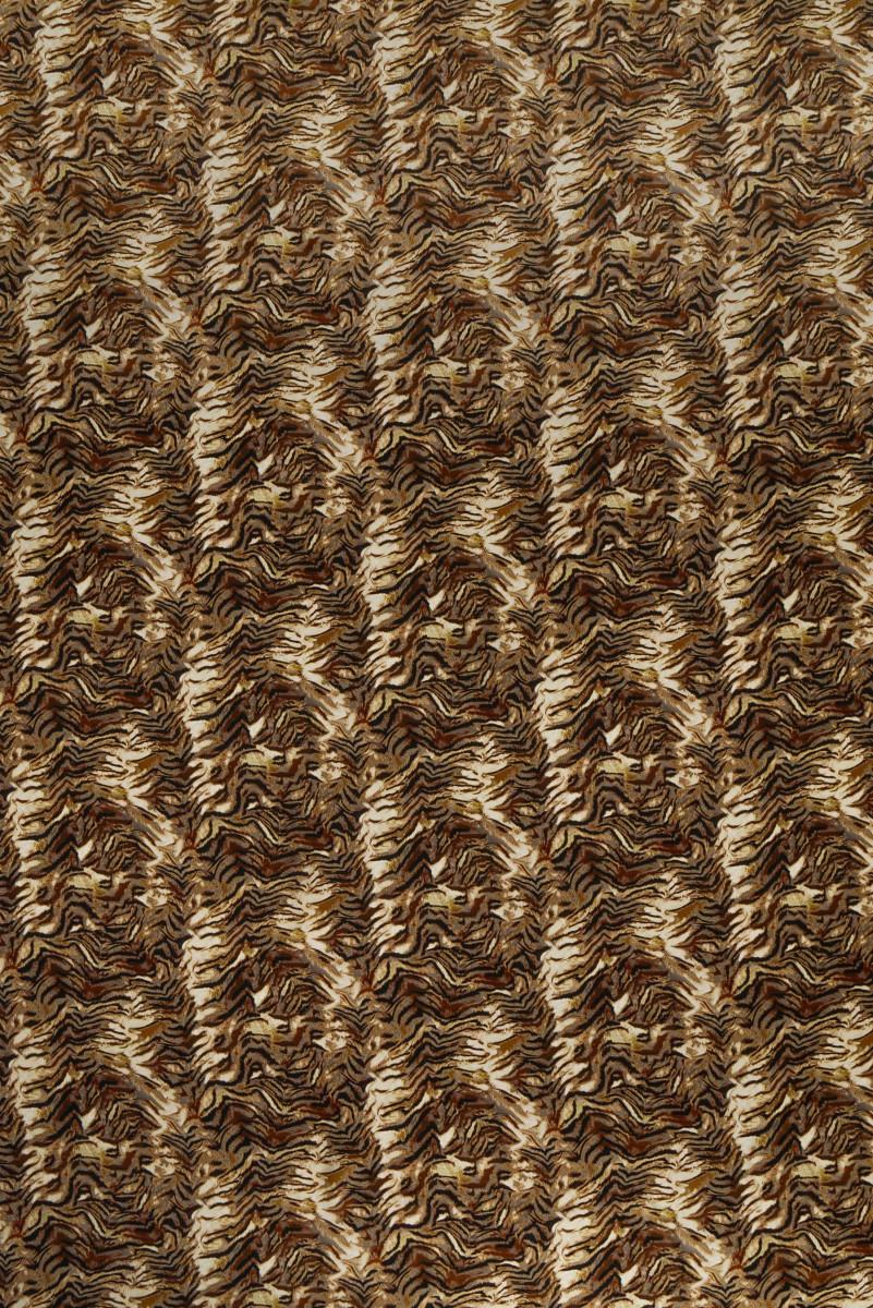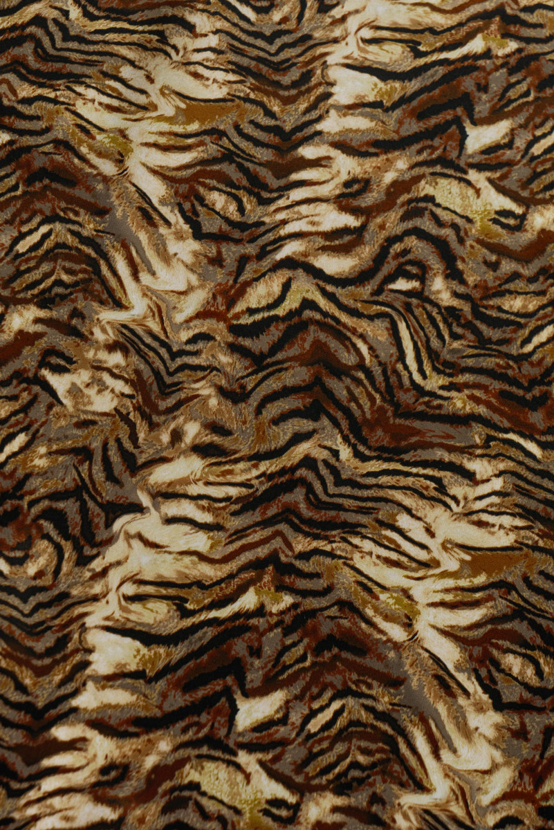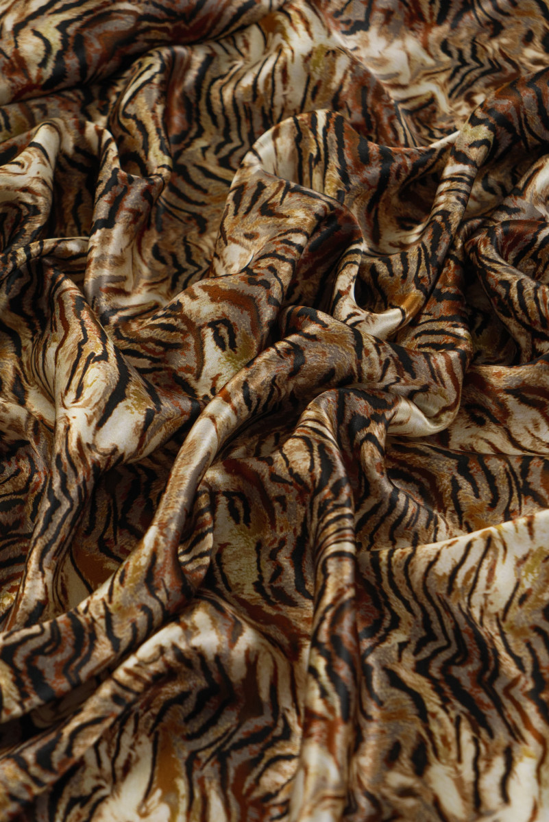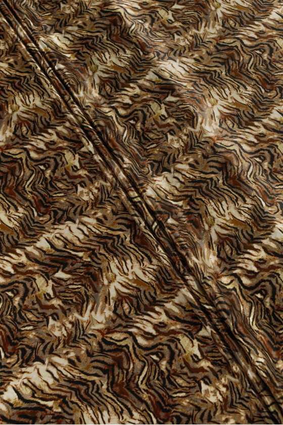Raso italiano 100% seta con motivo animalier nei colori nero e marrone. Il raso di seta è un tessuto denso e leggero con una superficie piana, realizzato in una trama di raso.