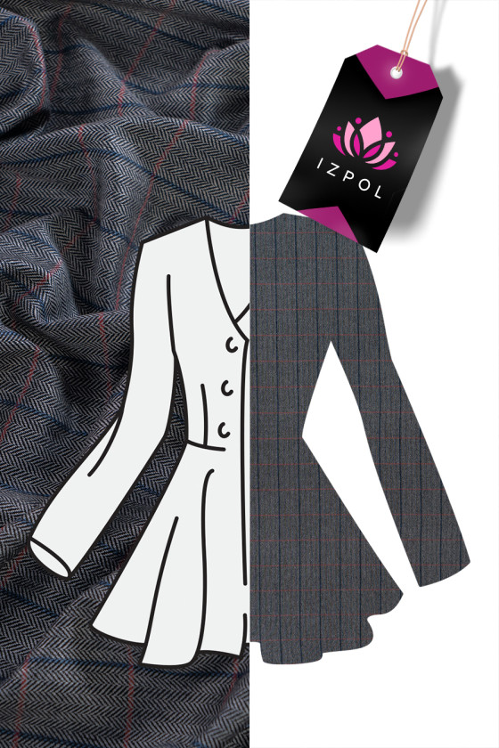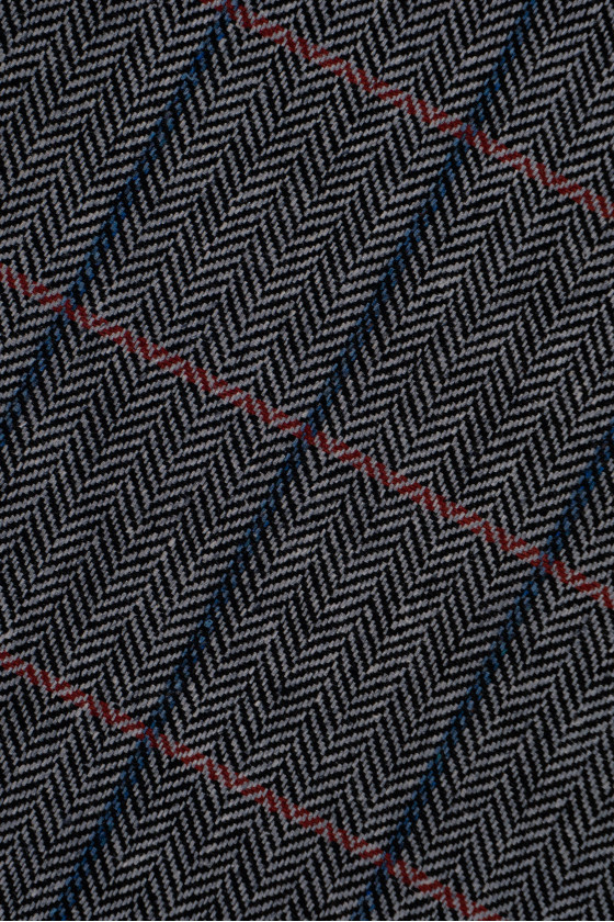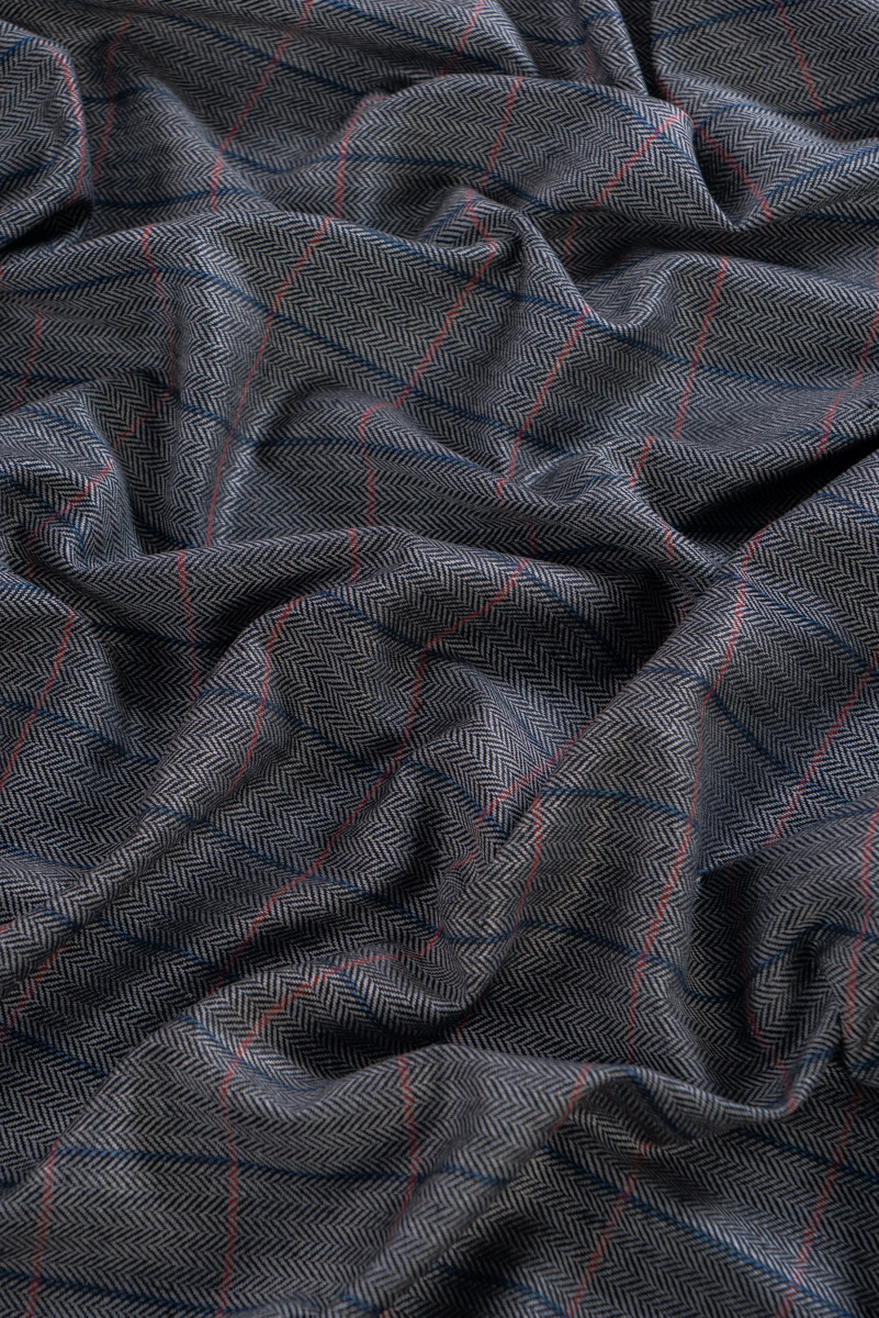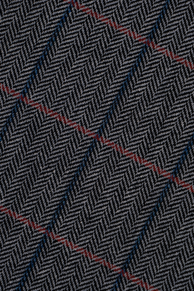 Tessuto per costumi italiani, 100% seta con trama simile alla lana, qualità di livello mondiale. Tessuto grigio e nero con motivo a spina di pesce e quadri bordeaux e blu, misura 4 cm * 5 cm. Un prodotto molto originale, morbido, anelastico con una nobile lucentezza caratteristica dei tessuti di seta. Perfetto per cucire un costume, pantaloni, abiti, gonne o abiti.