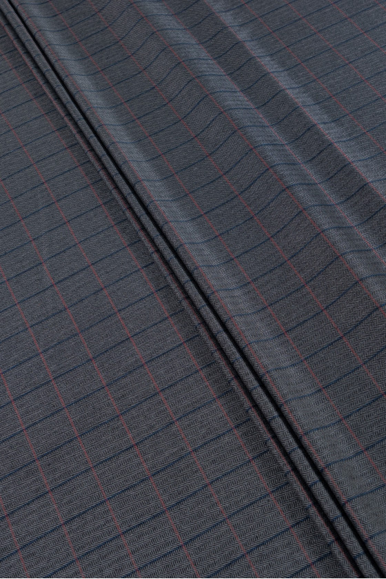 Tessuto per costumi italiani, 100% seta con trama simile alla lana, qualità di livello mondiale. Tessuto grigio e nero con motivo a spina di pesce e quadri bordeaux e blu, misura 4 cm * 5 cm.