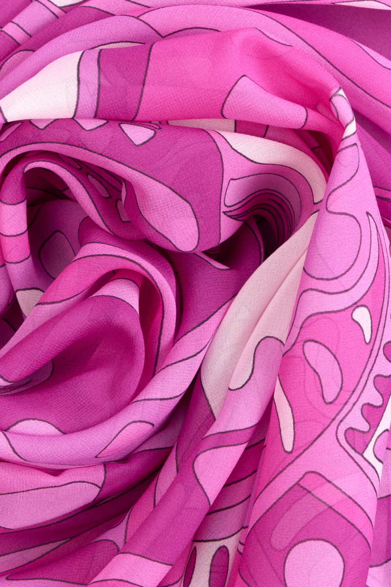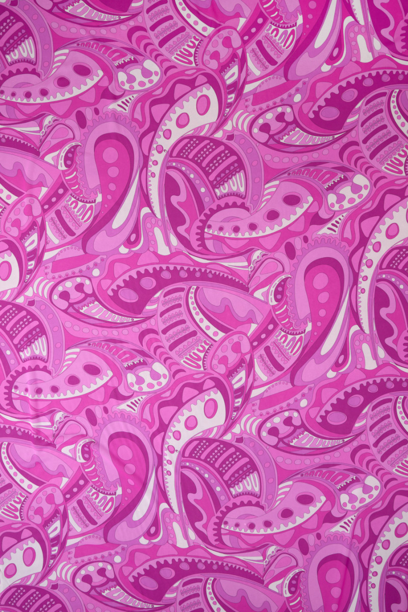 Chiffon italiano 100% seta con fantasie nei colori rosa intenso e panna. Il tessuto è molto delicato, piacevole al tatto, leggermente trasparente, fluido. Un motivo caratteristico di un noto stilista. Una proposta interessante da cui puoi evocare un vestito, una gonna o una camicetta unici.