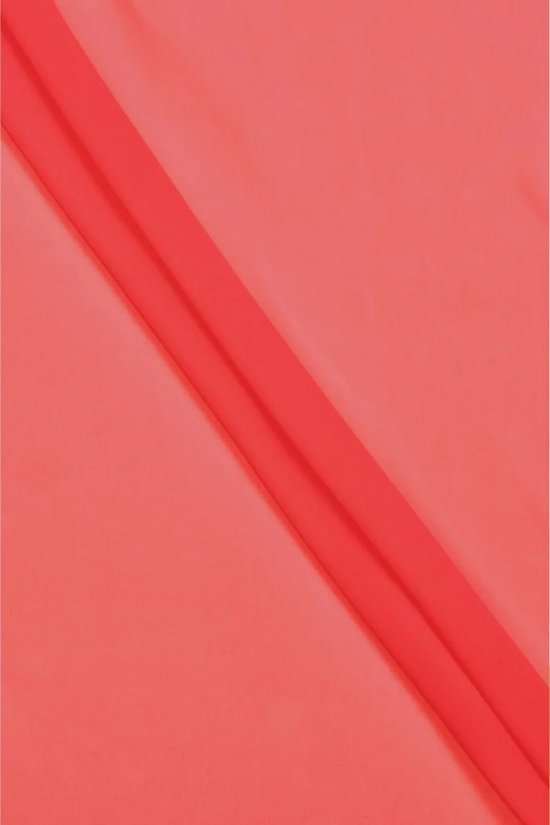 Georgette di seta italiana con aggiunta di elastano in rosso lampone. Il tessuto è sottile, trasparente ed elastico con una trama opaca e leggermente granata. È perfetta per cucire una camicetta elegante, gonna, vestito o sciarpa.