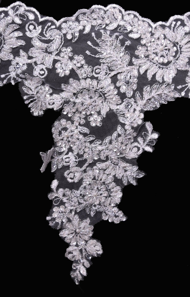 Fettuccia in pizzo color panna ricamata con pietre e paillettes. Tessuto rifinito su un lato con un dente. Perfetto per rifinire gli abiti da sposa.