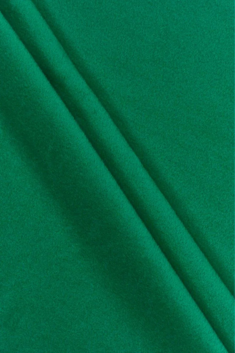 Tessuto cappotto italiano tessuto in lana naturale con l'aggiunta di mohair in verde. Le fibre di mohair sono lunghe con una lucentezza caratteristica che conferisce ai tessuti un carattere elegante. I tessuti mohair sono morbidi, soffici e delicati, e la miscela di lana naturale li rende ideali per i capispalla (cappotto, giacca, gilet) perché riscaldano e allo stesso tempo permettono alla pelle di respirare.