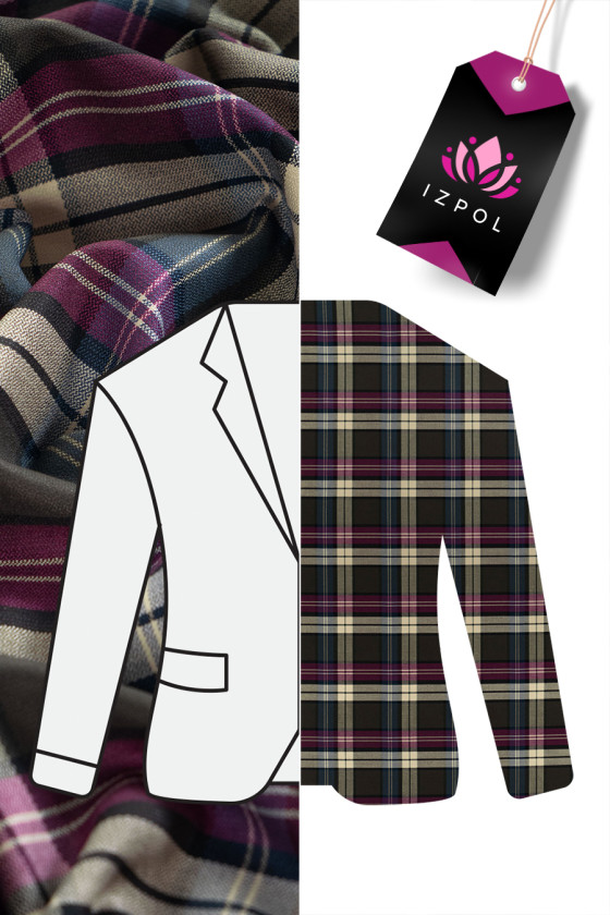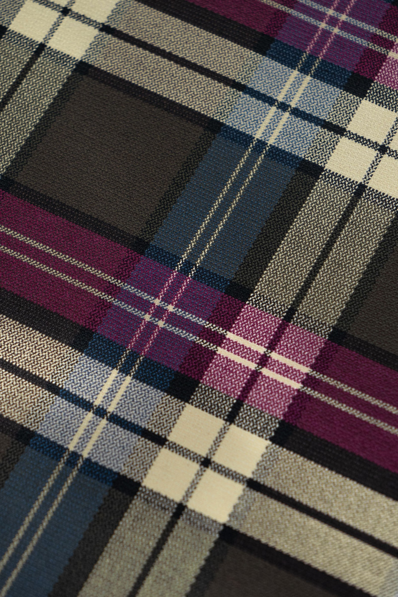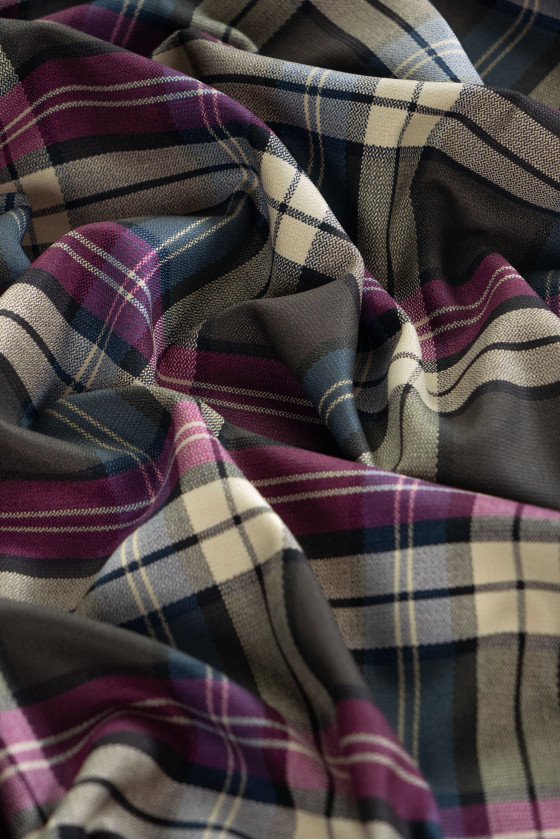 Tessuto costume italiano a scacchi (10 cm) nei colori beige, viola, blu e verde oliva. Una miscela di viscosa, poliestere ed elastan: la trama ricorda un tessuto di lana.