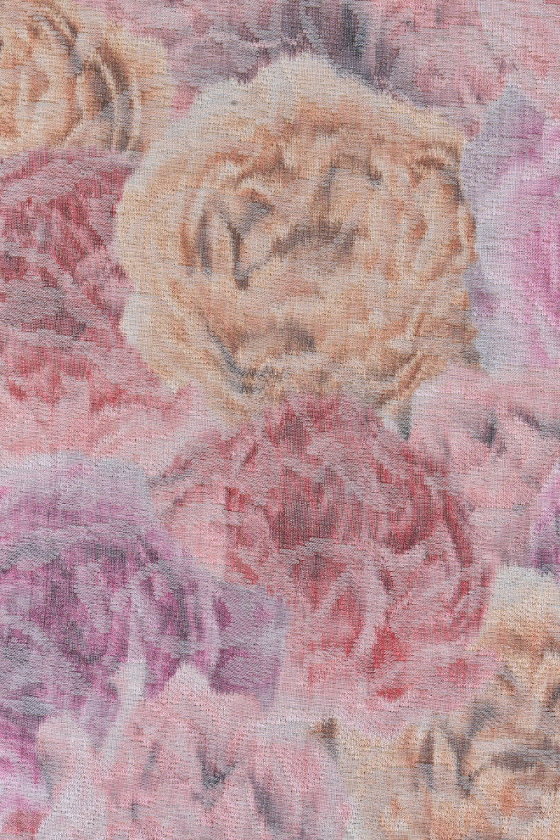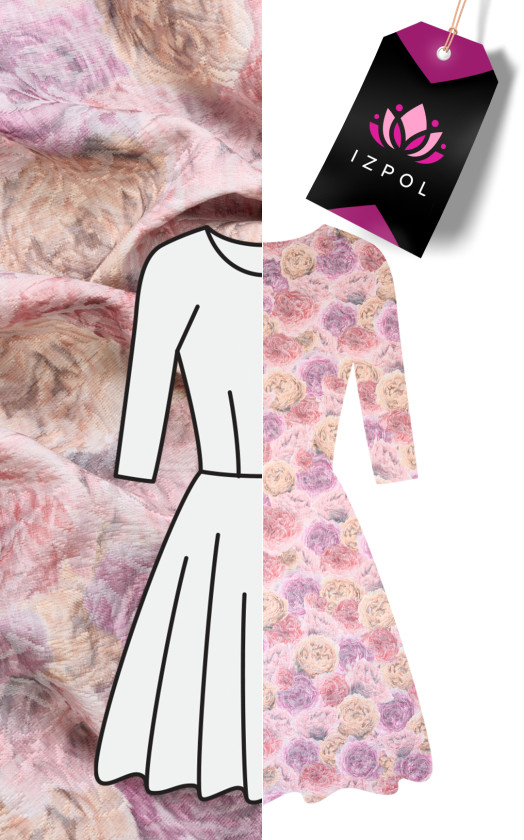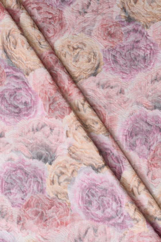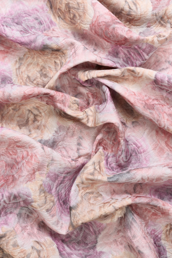 Tessuto jacquard italiano con grandi rose corallo, erica, arancio e salmone. Il tessuto ha una struttura convessa, è morbido, opaco e non elastico. Le rose sono realizzate in diverse dimensioni, da 8 cm a 13 cm. Una bella proposta per le persone che amano il design pastello e classico.