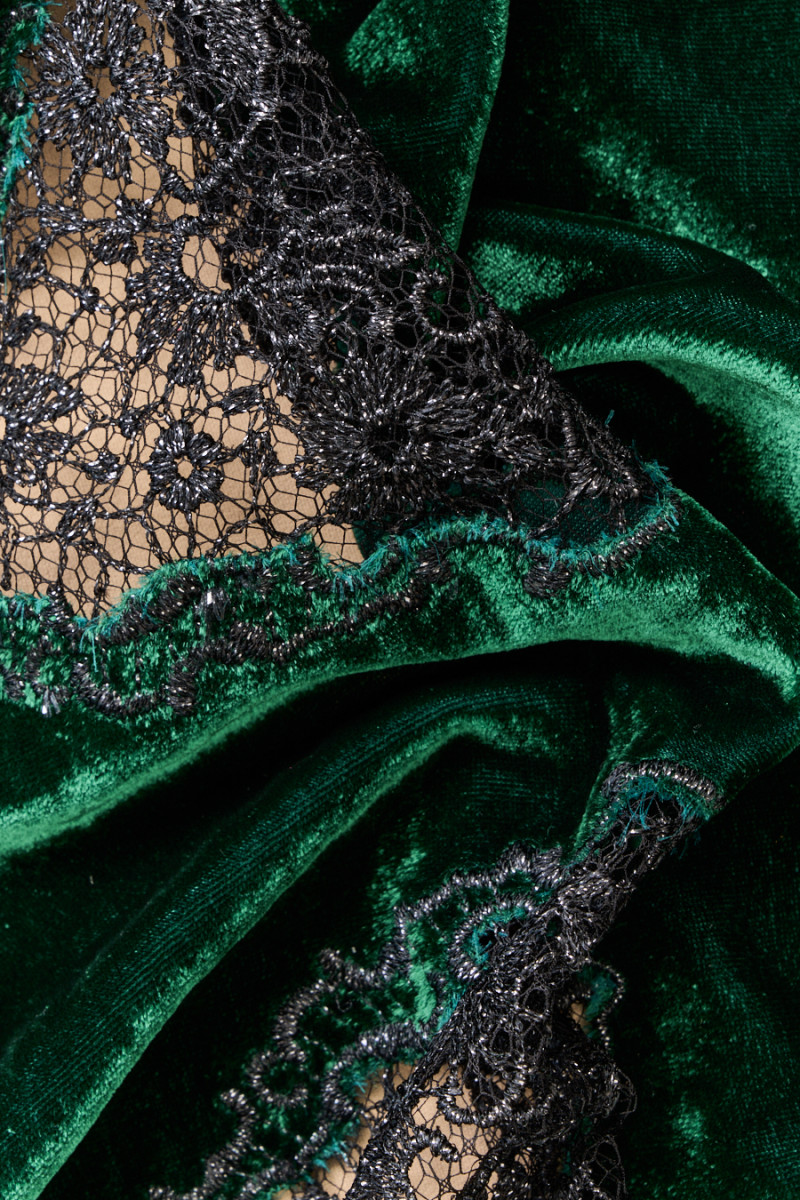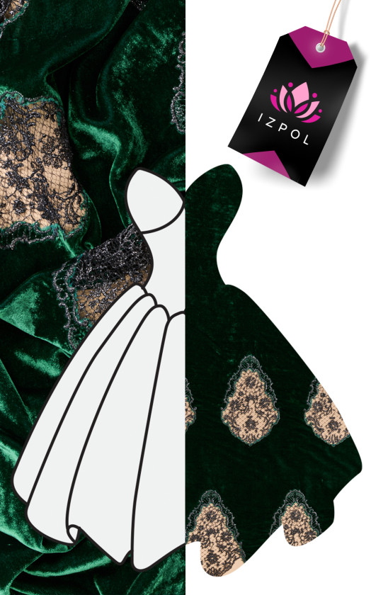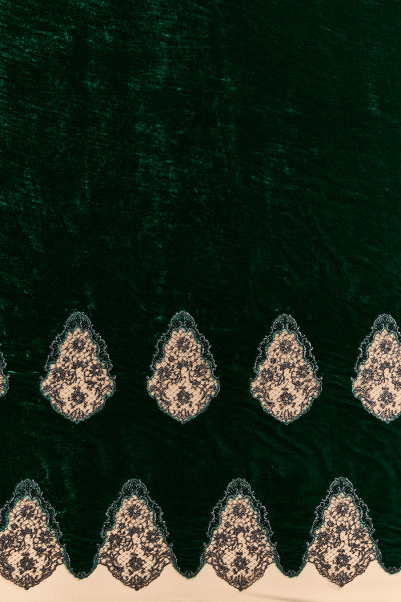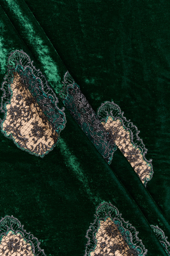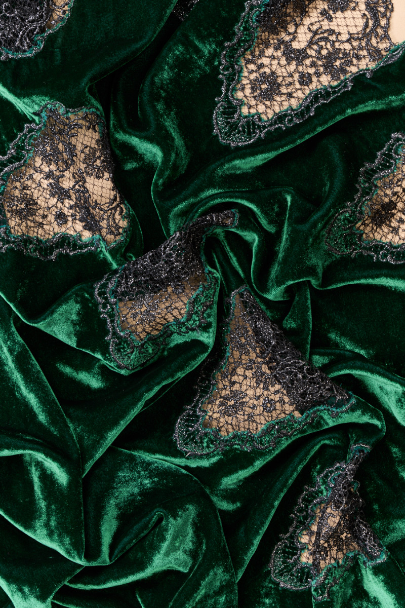 Italiano, esclusivo velluto verde bottiglia decorato con pizzo nero con filo lucido. Il tessuto è morbido, fluido, non elastico, sottile ma opaco. Drappeggia magnificamente e le decorazioni ricamate disposte su due file conferiscono al tessuto un aspetto unico e irripetibile. Elementi in pizzo alti 17 cm e larghi 11 cm, ripeti ogni 15 cm: il tessuto è cucito circonferenzialmente. Una proposta meravigliosa per creare un vestito, una gonna o una camicetta eleganti.