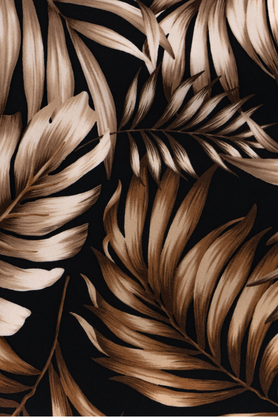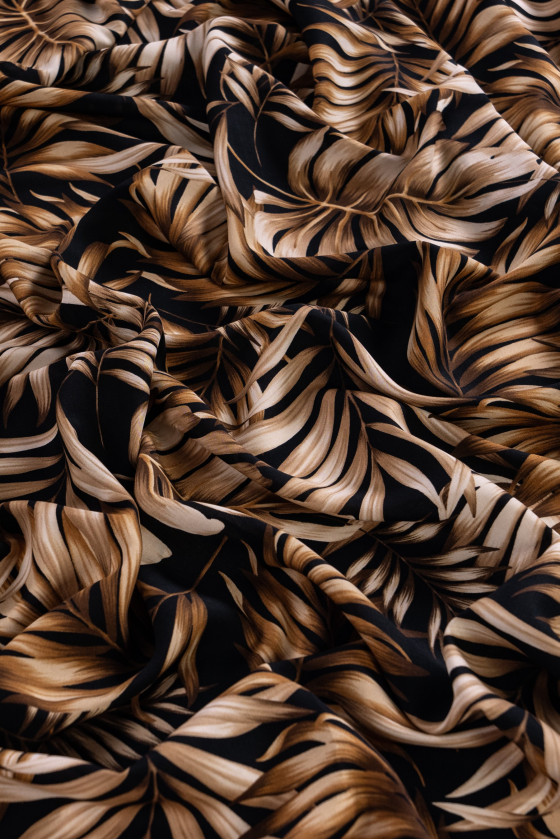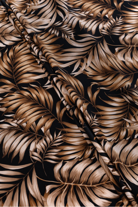 Tessuto italiano 100% viscosa di colore nero con motivo beige-marrone, foglie grandi. La viscosa è un tessuto naturale (ottenuto dalla cellulosa), molto morbido, arioso, opaco.