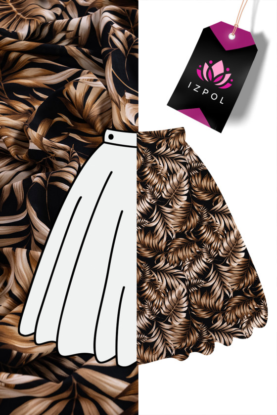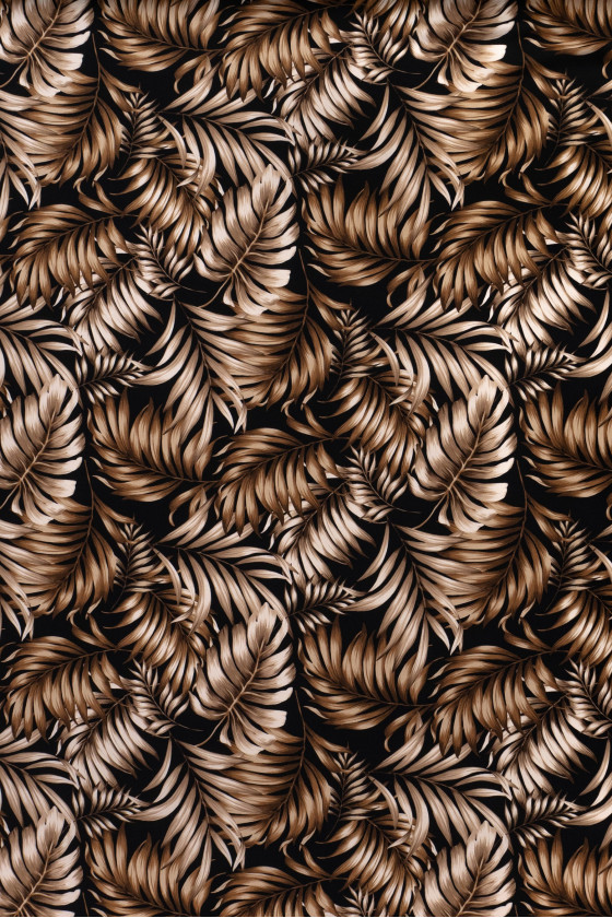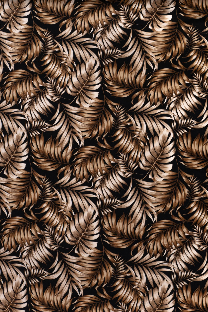 Tessuto italiano 100% viscosa di colore nero con motivo beige-marrone, foglie grandi. La viscosa è un tessuto naturale (ottenuto dalla cellulosa), molto morbido, arioso, opaco - perfetto per cucire un vestito estivo, una camicetta o una gonna.